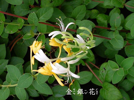 本品为忍冬科植物忍冬Lonicera japonica Thunb.、红腺忍冬Lonicera hypoglauca Miq.、山银花(毛萼忍冬)Lonicera confusa DC. 或毛花柱忍冬Lonicera dasystyla Rehd.的干燥花蕾或带初开的花。其有效成分含木犀草素、绿原酸类、番木鳖甙( loganin )、肌醇。